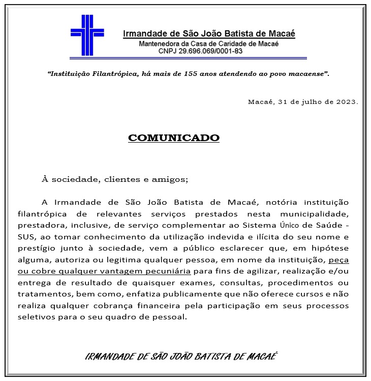 Surgiu do espírito altruístico do bom lusitano Antônio Joaquim D’Andrade que, emigrado para a colônia, ainda jovem veio parar na Vila de São João Batista de Macaé, onde acabou residindo até o final de seus dias. Aqui, ao explorar pequeno negócio de cuscuz, recebeu o apelido de Casculeiro; passou a chamar-se Antônio Joaquim D’Andrade Casculeiro sem degradação da imagem do honrado português. No dia 08 de novembro de 1862, como permanecera solteiro, fez lavrar em cartório seu testamento, deixando dois contos de réis que, depositados no Banco do Brasil, fossem destinados ao início da construção de uma Casa de Caridade, na qual seriam socorridos os necessitados. Cinco anos mais tarde, no dia 02 de dezembro de 1867, foi lançada a pedra fundamental desta obra. A Irmandade de São João Batista de Macaé, idealizado para administrar o Hospital Casa de Caridade nasceu no dia 22 de maio de 1872, em solenidade presidida pelo Juiz Municipal, Dr. Carlos de Souza Silveira, nomeado para Macaé a pedido do Duque de Caxias, conforme relata em carta este prestigiado militar, ao seu genro aqui residente. Foi eleito o Dr. João Álvares de Siqueira Bueno (Dr. Bueno), primeiro Provedor da Irmandade. Com o passar dos anos… O Hospital começou a funcionar e cresceu. A partir de 1º de agosto de 1954, passou a contar com o apoio das religiosas pertencentes a Associação das Filhas de Maria do Horto, chegando a Macaé as primeiras irmãs: Maria Leocádia, Maria do Carmo e Maria Inocência. Hoje, com mais de 125 leitos, 500 funcionários e um corpo clínico especializado, o nosso Hospital tem sido pioneiro dos grandes eventos médicos da região. Conta com modernas instalações em seus Centros de Tratamento Intensivo (CTI) e cirúrgico, equipados com tecnologia de ponta. Atualmente são realizadas mais de 500 cirurgias mensais. A propósito do funcionamento do Hospital, relatou o escritor macaense Antônio Alvarez Parada: “Se da grandeza do bom lusitano surgiu a Casa de Caridade, nessa mesma bondade ela tem se mantido até hoje, com o auxílio de seus dirigentes, de seu dedicado corpo de médicos e da eficiência das freiras que lhes prestam serviços… O Velho Hospital, por todos esses anos, tem prestado serviços que a pena humana não poderá descrever.”NOSSA VISÃO